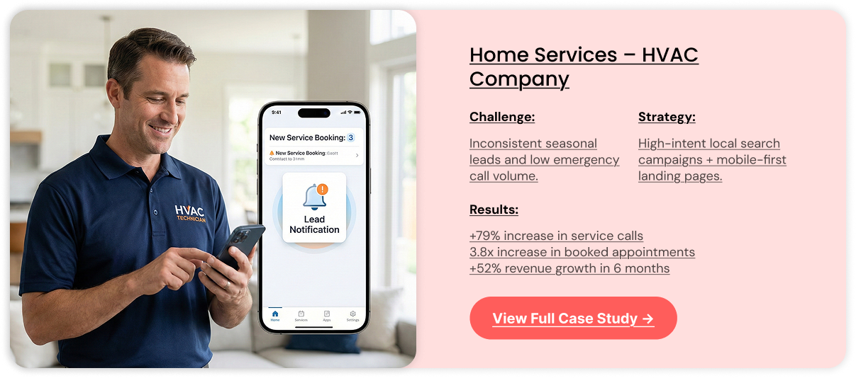 We struggled with inconsistent lead quality and rising ad costs. SEMBEAT helped us optimize our funnel, improve targeting, and implement conversion tracking properly. The result? 38% lower acquisition cost and steady monthly growth in booked HVAC projects.